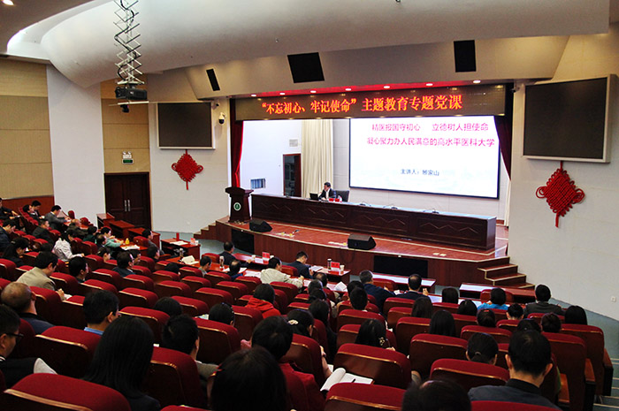 顾家山围绕深入学习贯彻习近平新时代中国特色社会主义思想,简要回顾了我校主题教育开展以来的工作成效,对照主题教育专题党课“四个讲清”要求,从理论维度、历史维度和实践维度详细生动地阐述了中国共产党初心和使命的内涵和重要意义。他结合我国高等教育新形势新问题和医学教育新特点新趋势,深入讲解了对习近平总书记关于教育卫生工作重要论述的学习体会;结合学校建设和主题教育开展情况,重点分析了学校在发展中存在的和师生反映集中的几个突出问题,并对进一步扎实开展主题教育,推动学校各项事业高质量发展提出明确要求。