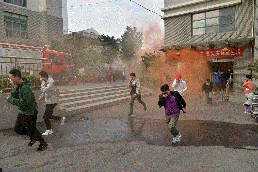 中午1230分,演练指令准时发出,消防警铃骤然响起,尚美楼4号、5号楼周围浓烟四起,应急疏散演练正式开始。各楼层学生在疏散引导员的指导下,弯着腰,用湿毛巾捂住口鼻,从安全疏散通道快速有序撤出。短短几分钟内,近2000名学生顺利疏散至安全区域。整个疏散演练过程有条不紊、安全有序,赢得了现场观摩师生的掌声阵阵。列队清点人数后,合肥市消防大队蜀山中队相关负责人对本次疏散演练活动作点评,演练活动取得圆满成功。