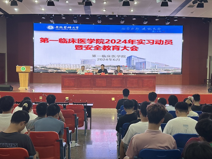 6月12日,第一临床医学院学生党总支在南校区多功能厅召开2024年实习动员暨安全教育大会。第一临床医学院党委副书记、学生党总支书记李琮作动员讲话,院学工部副部长孙民主持会议。