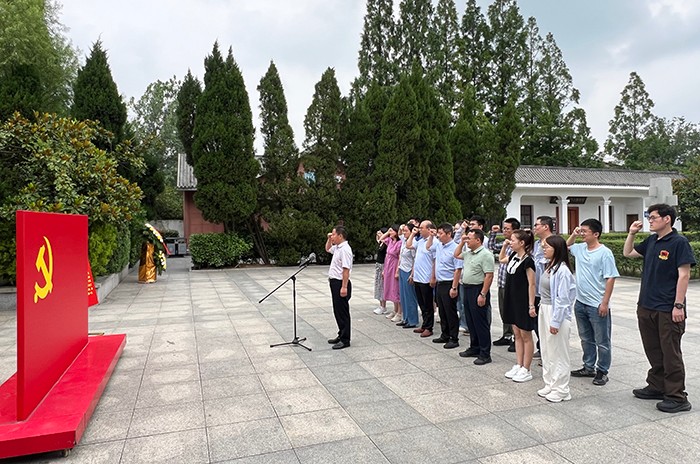 在烈士纪念碑前,该院党委书记骆广东领誓,全体党员整齐列队,面向烈士纪念碑和党旗宣誓,重温入党誓词。宣誓结束后,大家瞻仰烈士纪念碑,深切缅怀为中国解放事业作出杰出贡献的革命烈士。