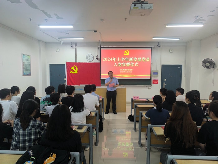 6月28日,卫生管理学院在校本部知行楼B座505教室举行新党员入党宣誓仪式,该院党委书记赵云峰出席活动,院党委副书记胡鹏主持仪式。学院各学生党支部书记、2024年新发展学生党员以及辅导员参加活动。