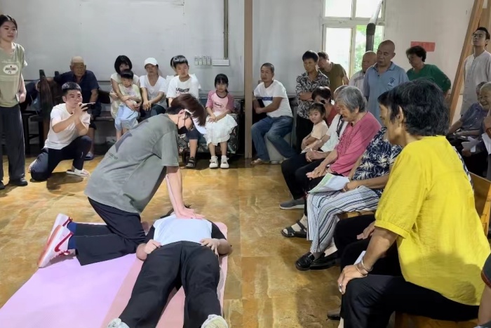 在“健康‘救’在身边,筑梦健康乡村”为主题的卫生健康知识普及和急救技能培训活动中,队员们聚焦糖尿病、肩周炎、冠心病等老年人常见疾病,为村民们提供预防及治疗建议;将理论与实践相结合,讲解并演示了心肺复苏相关知识和技能,真正践行“人人学急救,急救为人人”。其中一位队员谈道:“想到这些急救知识以后也许真的能挽救鲜活的生命,心里就多了一份责任与荣耀。”实践团还结合医工专业知识,就中西医对呼吸系统的理解和治疗方案的异同展开分享,就医工交叉学科前沿研究进行分享及深入交流。