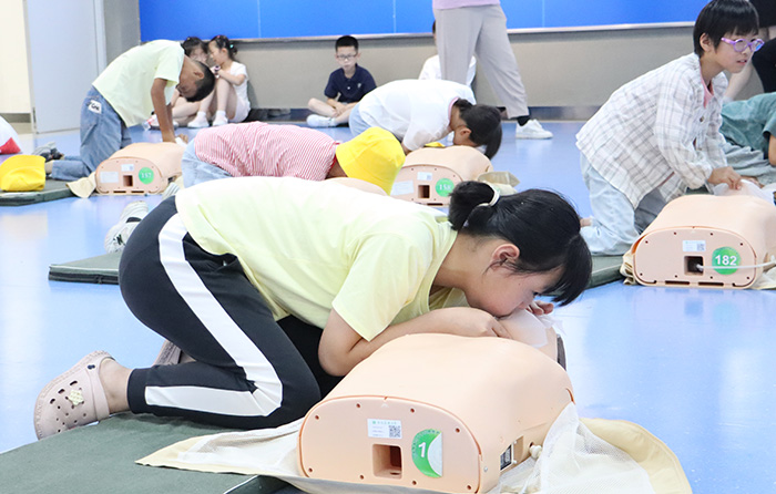 在省红十字应急救护培训安医大工作站,基地科普教师通过发放宣传册、播放科普视频、演示急救技能等多种方式,为村里的孩子和家长科普应急救护知识。工作站教师利用模拟器具,现场演示心肺复苏术及体外自动除颤仪(AED)的使用方法,并结合“轻拍重唤”“一听、二看、三感觉”“捏、包、哈、松”等通俗易懂的顺口溜,耐心细致地向孩子们展示心肺复苏的操作步骤。工作站教师还组织学生分组进行心肺复苏实操练习,帮助他们纠正操作手法,在实践中让同学们更快掌握心肺复苏技能;利用海姆立克训练马甲和“剪刀、石头、布”等口诀现场演绎海姆立克急救法,分析气道异物梗阻的原因,并通过模拟生活场景指导学生进行应急救护演练,以巩固所学知识。“回家我要将所学到急救技巧传递给身边人。”泽沟村小学生徐家昊自信地说道。