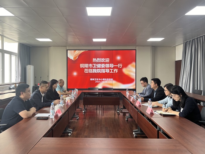 10月12日下午,精神卫生与心理科学学院与铜陵市卫生健康委员会开展合作交流。铜陵市卫生健康委员会主任汪益祥,铜陵市第三人民医院党委书记鲁国,学院党委书记凌春笋、院长朱春燕出席会议。