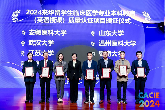 10月31日至11月2日,第25届中国国际教育年会在北京国家会议中心举行,43所高校获颁来华留学质量认证证书。我校顺利通过来华留学生临床医学专业本科教育(英语授课)质量认证,获得六年认证有效期、评价等级A等级。