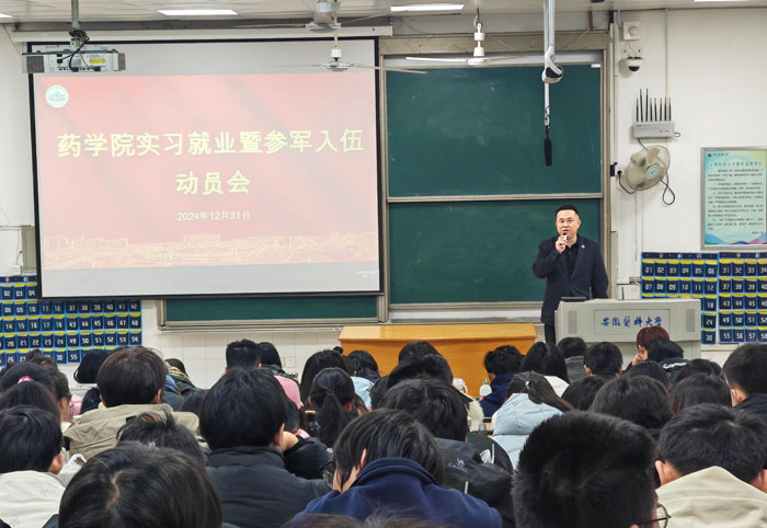 2024年12月31日,药学院举办2025届本科生实习就业暨参军入伍动员会,为即将转段实习的毕业班学生提供全方位指导,激发学生参军热情,帮助他们明确方向、树立信心。学院领导班子成员骆广东、孟晓明、李晓松、吴繁荣参加会议并作动员讲话。