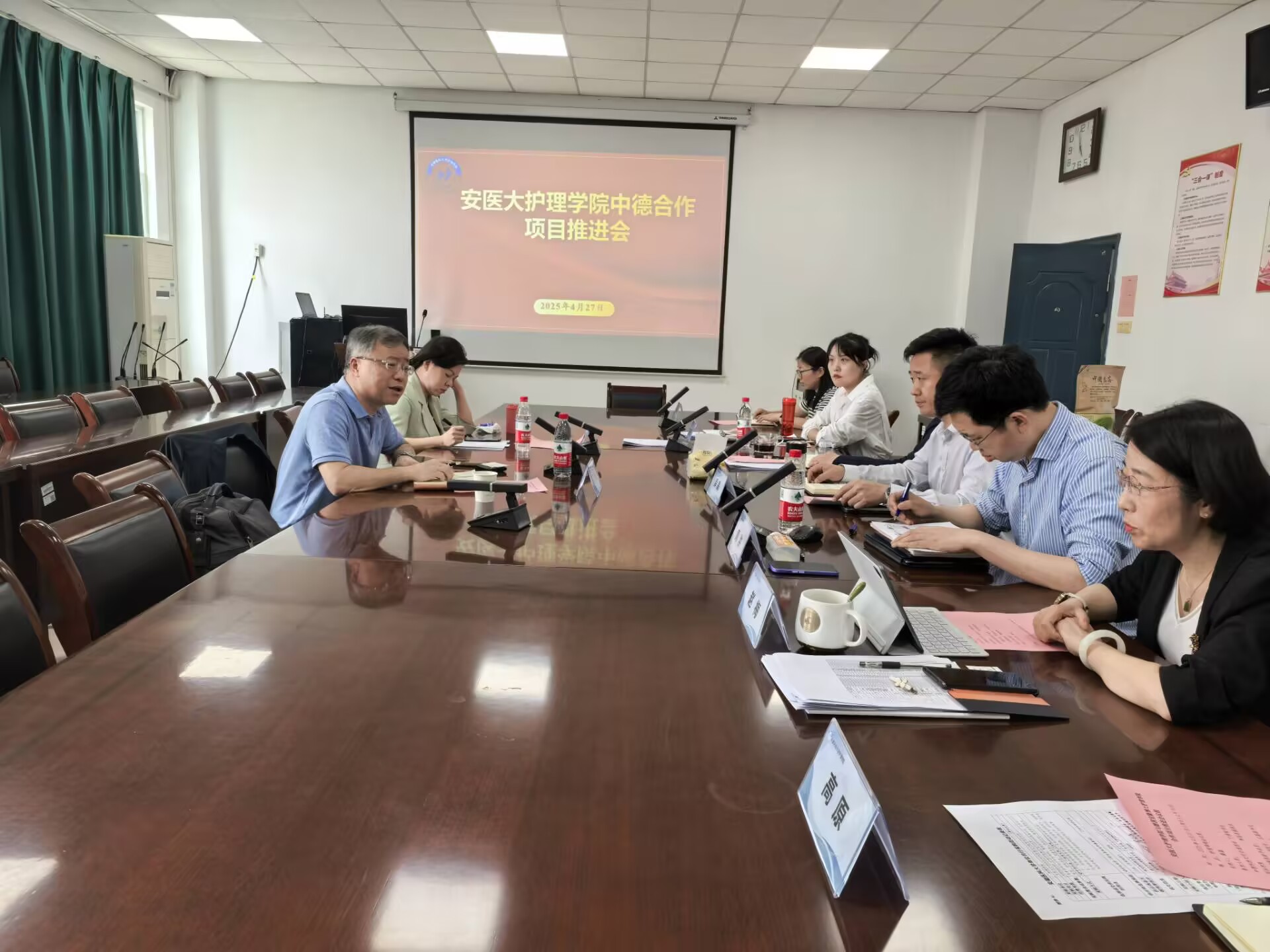 4月27日上午,护理学院召开中德合作项目推进会。会议由院党委书记薛磊主持,德国萨克森经济教育协会中国护理项目负责人丁涛,国际学院副院长李菲菲,护理学院院长周洪,院党委副书记、纪委书记王磊,副院长赵梅、陈滢出席会议。
