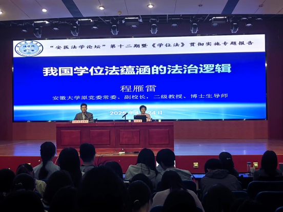 4月24日下午,“安医法学论坛”第12期暨学位法贯彻实施专题报告在翡翠路校区怀远楼四楼报告厅举办。安徽大学原党委常委、副校长程雁雷教授受邀,作了题为《我国学位法蕴涵的法治逻辑》的专题报告。法学院院长马青连主持论坛,近200名师生参加。